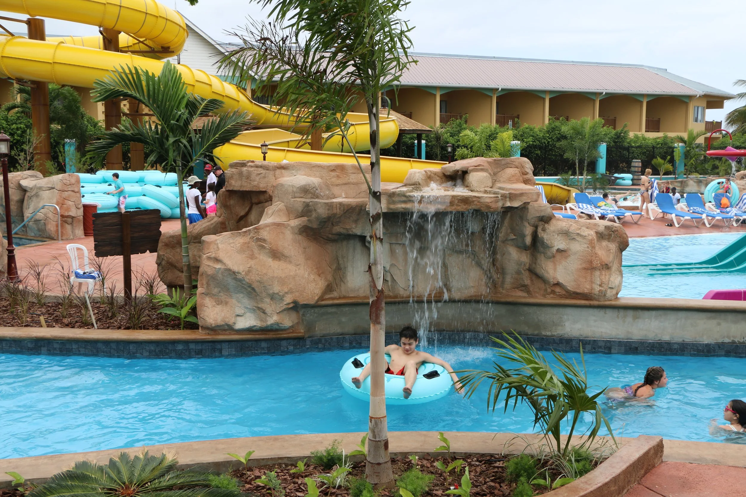 An artificial rock resort water park with pools, slides, and lounge chairs, surrounded by palm trees and greenery.