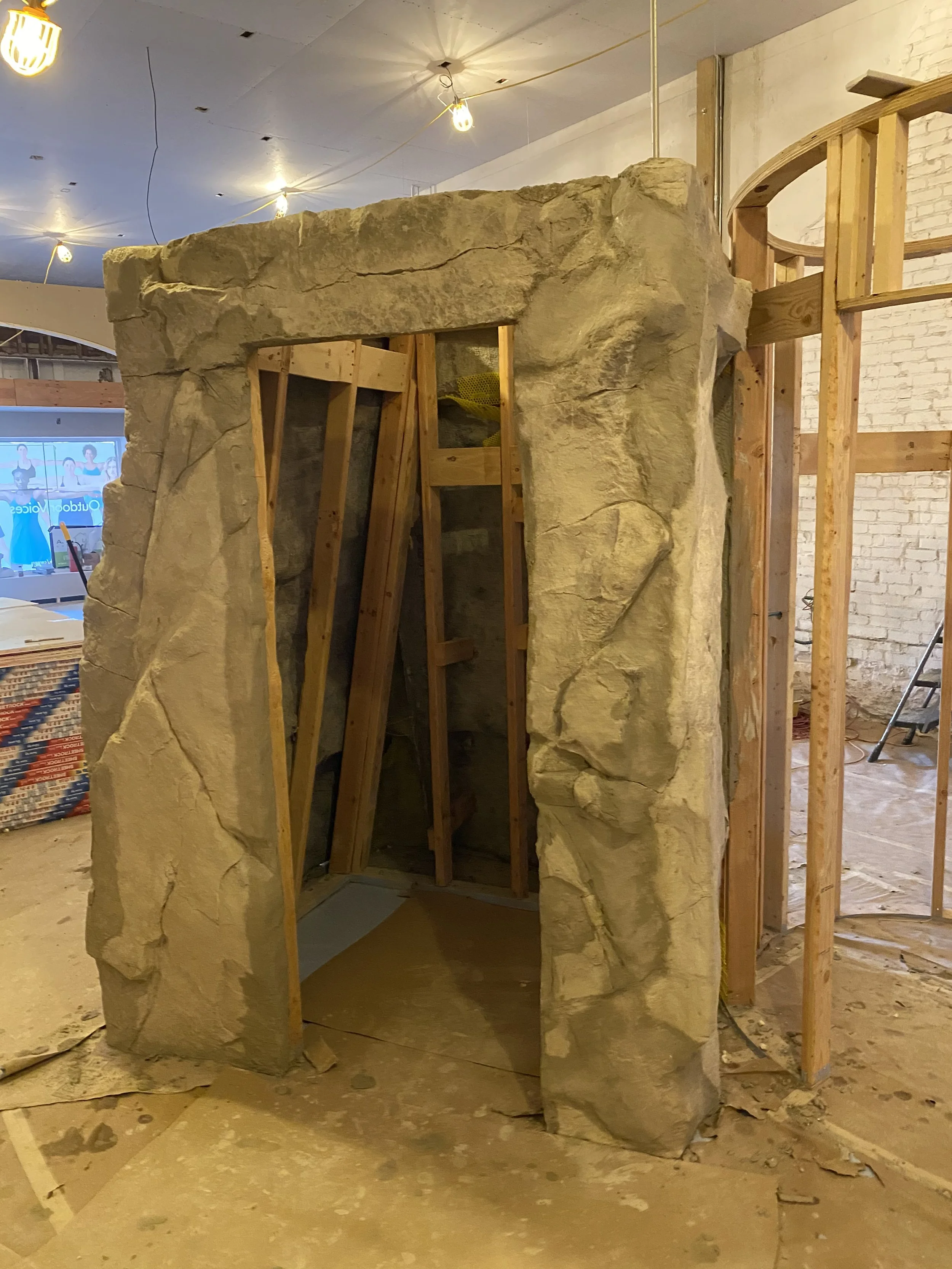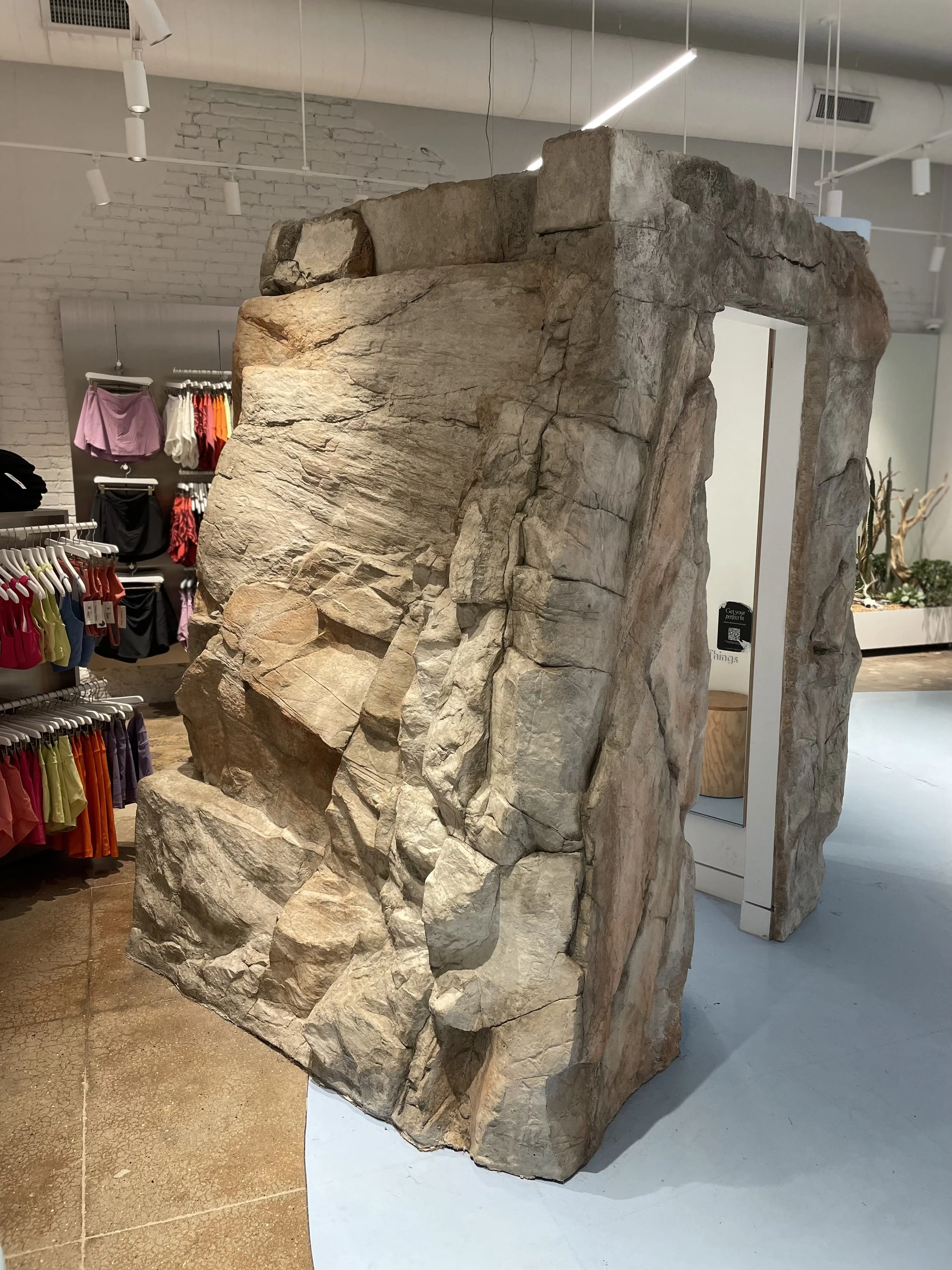The Outdoor Voices project involved designing freestanding boulder-like changing room for an interior retail space. We utilized lag bolts to securely anchor our concrete castings to a wooden structure, ensuring stability and aesthetic appeal.